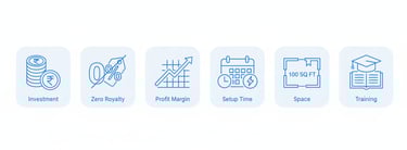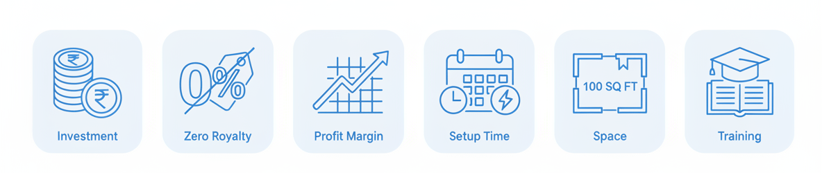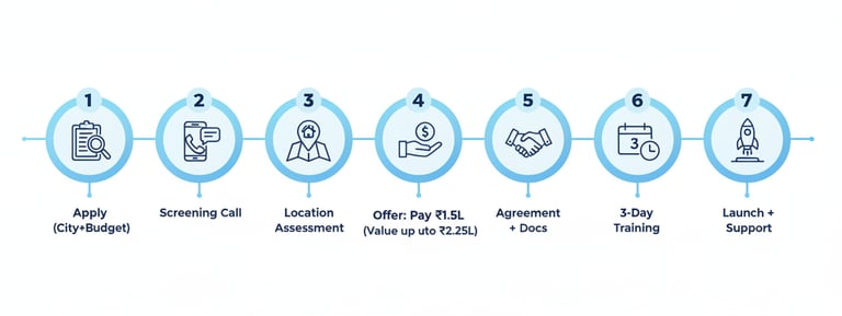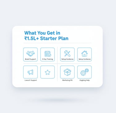 Is plan mein aapko brand support, training, setup guidance aur launch support milta hai. Exact inclusions city/location ke hisaab se vary ho sakte hain.